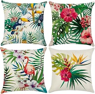 Luzoeo Housse de Coussin Oreiller 4 Pcs Lin Décoratif Imprime Feuilles Vertes Fleur Flamingo Taie Oreiller Flamant Décoration Maison Chambre Salon Bureau Coussin Canapé Voiture Lit 45x45 cm (B)